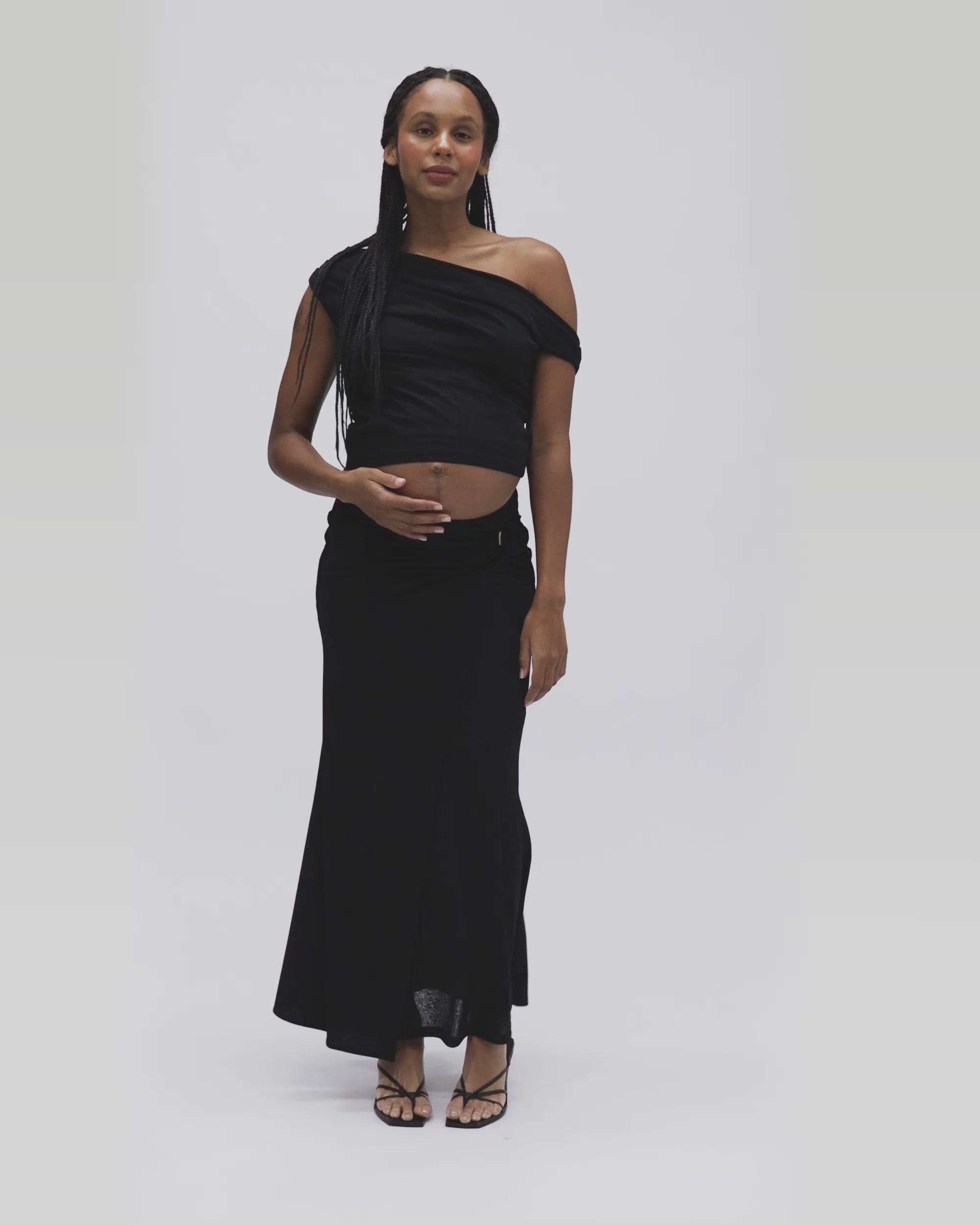 Elevate your maternity style with the Rhi Off Shoulder Top. Crafted from soft, lightweight slub stretch jersey, it features a semi-fitted silhouette and an asymmetrical off-the-shoulder neckline. The lined bodice offers comfort and support, while the sleeveless design makes it perfect for warm days or nights. Whether paired with denim or the matching Rhi Mock Wrap Skirt, this top is your go-to for effortless, elevated style.
